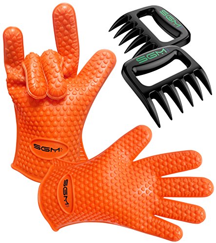 2-in-1 Barbecue Grill Kit - Silicone Cooking Gloves + Meat ClawsHome cooks and grilling enthusiast depend on essential tools to create masterpieces in the kitchen.Let us help you with your next juicy turkey or savory rack of ribs! See the pictures above for the an extra high-quality set of Grilling Gloves and Meat Claws by SGM!Features:2 Silicone Glove - Full five-finger super grip made of long-lasting thick silicone. Guards against 425F of heat or freezing temperatures!2 Bear Claws - Wide forks and heavy design make it easy and comfortable to pull mouth-watering strips of brisket or lift tender chunks from a rack of ribs!Food-Grade Materials - Entire set is non-melting and third-party inspected for safety. Everything you prepare with this kit will be safe to eat!100% MONEY BACK GUARANTEEWe guarantee that you will be absolutely happy with your purchase. If for any reason you are not satisfied with your new set of gloves and claws, simply send it back for a full refund! No questions ask