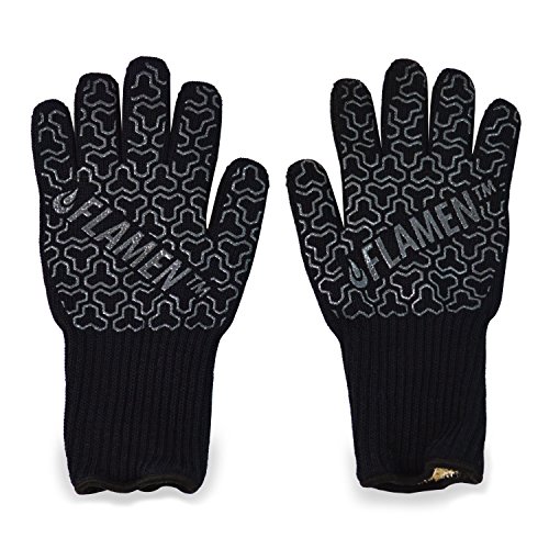 Never burn your hand again. The Flamen Extended-Cuff Premium Heat-Resistant BBQ & Fireplace Glove allows you to safely handle coals, utensils, hot food and other items while cooking at the grill. It features a grip-securing silicone pattern, and high-temperature resistant aramid fibers. You'll have more freedom than with regular silicone gloves or oven mitts, because of the soft, flexible fabric, and articulated fingers.